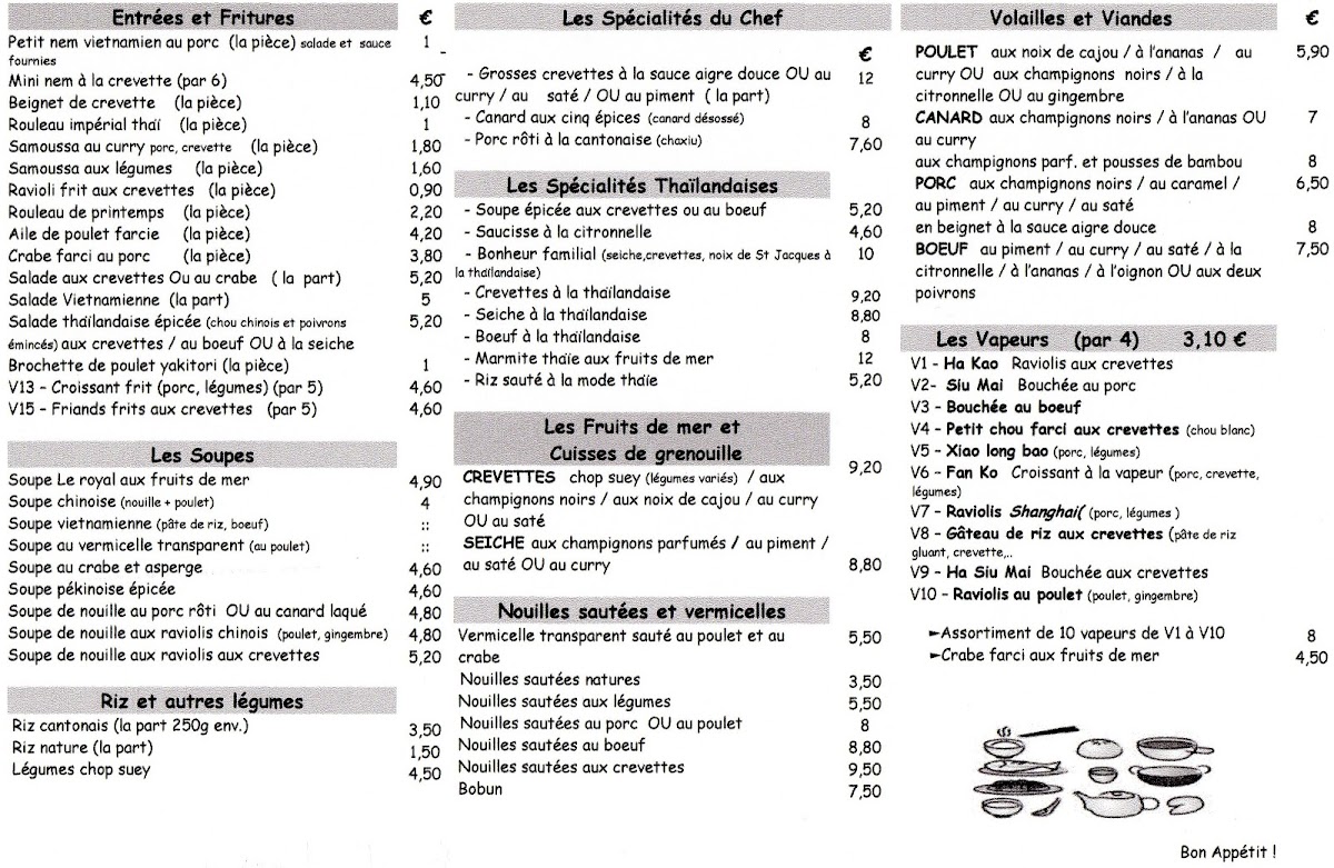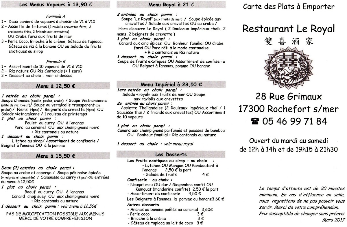 The menu at Le Royal offers a delightful blend of traditional French cuisine with a touch of elegance. A standout dish is the Soupe, which provides a rich, comforting start to any meal, expertly crafted with fresh ingredients. For those craving more substantial fare, the restaurant serves a variety of main courses that showcase the depth of French cooking, such as the succulent duck confit and perfectly seared fish fillets. Each dish is a testament to the skill and care of the chefs, balancing flavors and textures with precision. The prices are reflective of the high-quality ingredients and craftsmanship, ensuring that each meal is an experience to savor. Whether you're in the mood for a light appetizer or a hearty main course, Le Royal's menu promises to satisfy with its exquisite offerings.